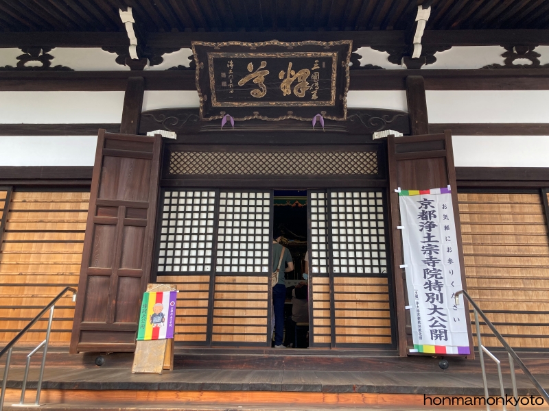 釈迦堂の前には「京都浄土宗寺院特別大公開」ののぼり幡が立っています。大公開の案内にもあった、「三国伝来釈迦牟尼仏」の御開帳と「釈迦涅槃図」の絵解きが行われました。絵解きとは、絵図を見ながら、仏様に代わって和尚さんが説教をされることを言います。
